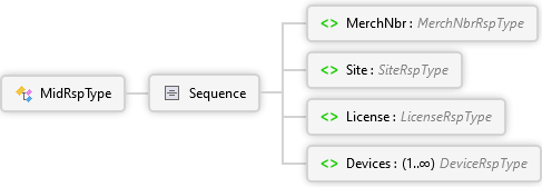 <xs:complexType name="MidRspType" xmlns:xs="http://www.w3.org/2001/XMLSchema"> <xs:sequence> <xs:element name="MerchNbr" type="MerchNbrRspType" /> <xs:element name="Site" type="SiteRspType" /> <xs:element name="License" type="LicenseRspType" /> <xs:element name="Devices" type="DeviceRspType" maxOccurs="unbounded" /> </xs:sequence> </xs:complexType>