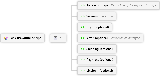 <xs:complexTypename="PosAltPayAuthReqType"xmlns:xs="http://www.w3.org/2001/XMLSchema"><xs:all><xs:elementname="TransactionType"type="AltPaymentTxnType"><xs:annotation><xs:documentation><pxmlns="http://Hps.Exchange.PosGateway">Alternate Payment Transaction Type</p></xs:documentation></xs:annotation></xs:element><xs:elementname="SessionId"type="xs:string"><xs:annotation><xs:documentation><pxmlns="http://Hps.Exchange.PosGateway">Unique Session Id</p></xs:documentation></xs:annotation></xs:element><xs:elementname="Buyer"minOccurs="0"><xs:annotation><xs:documentation><pxmlns="http://Hps.Exchange.PosGateway">Buyer Information for the authorization</p></xs:documentation></xs:annotation><xs:complexType><xs:sequencemaxOccurs="50"><xs:elementname="NameValuePair"type="NameValuePairType"/></xs:sequence></xs:complexType></xs:element><xs:elementname="Amt"type="amtType"minOccurs="0"><xs:annotation><xs:documentation><pxmlns="http://Hps.Exchange.PosGateway">Amount for the authorization</p></xs:documentation></xs:annotation></xs:element><xs:elementname="Shipping"minOccurs="0"><xs:annotation><xs:documentation><pxmlns="http://Hps.Exchange.PosGateway">Shipping Information for the authorization</p></xs:documentation></xs:annotation><xs:complexType><xs:sequencemaxOccurs="10"><xs:elementname="Address"type="NameValuePairCollectionType"><xs:annotation><xs:documentation>Address Information</xs:documentation></xs:annotation></xs:element></xs:sequence></xs:complexType></xs:element><xs:elementname="Payment"minOccurs="0"><xs:annotation><xs:documentation><pxmlns="http://Hps.Exchange.PosGateway">Payment Information for the authorization</p></xs:documentation></xs:annotation><xs:complexType><xs:sequencemaxOccurs="200"><xs:elementname="NameValuePair"type="NameValuePairType"/></xs:sequence></xs:complexType></xs:element><xs:elementname="LineItem"minOccurs="0"><xs:annotation><xs:documentation><pxmlns="http://Hps.Exchange.PosGateway">Line Item purchase information for the authorization</p></xs:documentation></xs:annotation><xs:complexType><xs:sequencemaxOccurs="100"><xs:elementname="Detail"type="NameValuePairCollectionType"><xs:annotation><xs:documentation>Detail Information</xs:documentation></xs:annotation></xs:element></xs:sequence></xs:complexType></xs:element></xs:all></xs:complexType>
