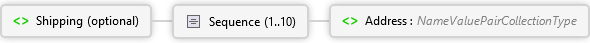 <xs:elementname="Shipping"minOccurs="0"xmlns:xs="http://www.w3.org/2001/XMLSchema"><xs:annotation><xs:documentation><pxmlns="http://Hps.Exchange.PosGateway">Shipping Information for the authorization</p></xs:documentation></xs:annotation><xs:complexType><xs:sequencemaxOccurs="10"><xs:elementname="Address"type="NameValuePairCollectionType"><xs:annotation><xs:documentation>Address Information</xs:documentation></xs:annotation></xs:element></xs:sequence></xs:complexType></xs:element>