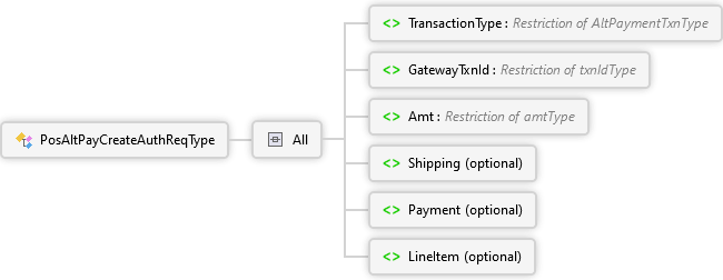 LineItem Element Payment Element Shipping Element Amt Element GatewayTxnId Element TransactionType Element All PosAltPayCreateAuthReqType Complex Type
