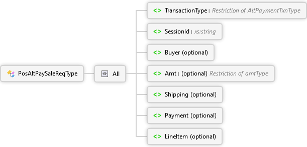 <xs:complexTypename="PosAltPaySaleReqType"xmlns:xs="http://www.w3.org/2001/XMLSchema"><xs:all><xs:elementname="TransactionType"type="AltPaymentTxnType"><xs:annotation><xs:documentation><pxmlns="http://Hps.Exchange.PosGateway">Alternate Payment Transaction Type</p></xs:documentation></xs:annotation></xs:element><xs:elementname="SessionId"type="xs:string"><xs:annotation><xs:documentation><pxmlns="http://Hps.Exchange.PosGateway">Unique Session Id</p></xs:documentation></xs:annotation></xs:element><xs:elementname="Buyer"minOccurs="0"><xs:annotation><xs:documentation><pxmlns="http://Hps.Exchange.PosGateway">Buyer Information for the sale</p></xs:documentation></xs:annotation><xs:complexType><xs:sequencemaxOccurs="50"><xs:elementname="NameValuePair"type="NameValuePairType"/></xs:sequence></xs:complexType></xs:element><xs:elementname="Amt"type="amtType"minOccurs="0"><xs:annotation><xs:documentation><pxmlns="http://Hps.Exchange.PosGateway">Amount for the sale</p></xs:documentation></xs:annotation></xs:element><xs:elementname="Shipping"minOccurs="0"><xs:annotation><xs:documentation><pxmlns="http://Hps.Exchange.PosGateway">Shipping Information for the sale</p></xs:documentation></xs:annotation><xs:complexType><xs:sequencemaxOccurs="10"><xs:elementname="Address"type="NameValuePairCollectionType"><xs:annotation><xs:documentation>Address Information</xs:documentation></xs:annotation></xs:element></xs:sequence></xs:complexType></xs:element><xs:elementname="Payment"minOccurs="0"><xs:annotation><xs:documentation><pxmlns="http://Hps.Exchange.PosGateway">Payment Information for the sale</p></xs:documentation></xs:annotation><xs:complexType><xs:sequencemaxOccurs="200"><xs:elementname="NameValuePair"type="NameValuePairType"/></xs:sequence></xs:complexType></xs:element><xs:elementname="LineItem"minOccurs="0"><xs:annotation><xs:documentation><pxmlns="http://Hps.Exchange.PosGateway">Line Item purchase information for the sale</p></xs:documentation></xs:annotation><xs:complexType><xs:sequencemaxOccurs="100"><xs:elementname="Detail"type="NameValuePairCollectionType"><xs:annotation><xs:documentation>Detail Information</xs:documentation></xs:annotation></xs:element></xs:sequence></xs:complexType></xs:element></xs:all></xs:complexType>