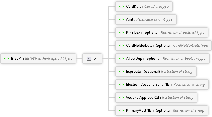 <xs:elementname="Block1"type="EBTFSVoucherReqBlock1Type"xmlns:xs="http://www.w3.org/2001/XMLSchema"><xs:annotation><xs:documentation><pxmlns="http://Hps.Exchange.PosGateway">Contains a series of required and optional elements</p></xs:documentation></xs:annotation></xs:element>