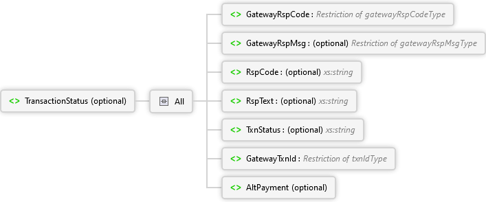 AltPayment Element GatewayTxnId Element TxnStatus Element RspText Element RspCode Element GatewayRspMsg Element GatewayRspCode Element All TransactionStatus Element