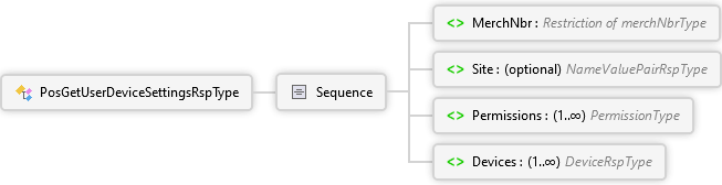 <xs:complexType name="PosGetUserDeviceSettingsRspType" xmlns:xs="http://www.w3.org/2001/XMLSchema"> <xs:sequence> <xs:element name="MerchNbr" type="merchNbrType" /> <xs:element name="Site" type="NameValuePairRspType" minOccurs="0" /> <xs:element name="Permissions" type="PermissionType" maxOccurs="unbounded" /> <xs:element name="Devices" type="DeviceRspType" maxOccurs="unbounded" /> </xs:sequence> </xs:complexType>