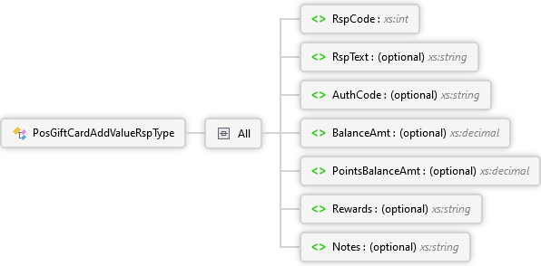 Notes Element Rewards Element PointsBalanceAmt Element BalanceAmt Element AuthCode Element RspText Element RspCode Element All PosGiftCardAddValueRspType Complex Type