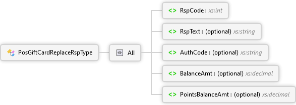 PointsBalanceAmt Element BalanceAmt Element AuthCode Element RspText Element RspCode Element All PosGiftCardReplaceRspType Complex Type
