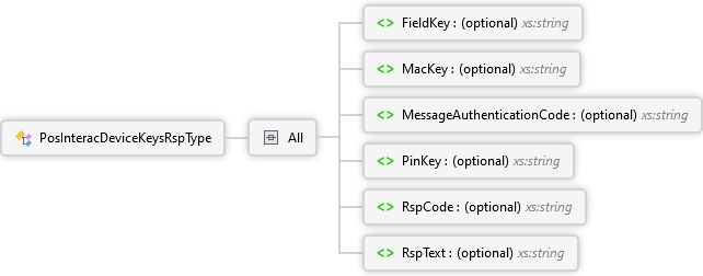 <xs:complexTypename="PosInteracDeviceKeysRspType"xmlns:xs="http://www.w3.org/2001/XMLSchema"><xs:all><xs:elementname="FieldKey"type="xs:string"minOccurs="0"><xs:annotation><xs:documentation><pxmlns="http://Hps.Exchange.PosGateway">Key generated and provided to the PIN pad. This key is used to decrypt the balance information.</p></xs:documentation></xs:annotation></xs:element><xs:elementname="MacKey"type="xs:string"minOccurs="0"><xs:annotation><xs:documentation><pxmlns="http://Hps.Exchange.PosGateway">Key generated and provided to the PIN pad. Key is used to generate the MAC value.</p></xs:documentation></xs:annotation></xs:element><xs:elementname="MessageAuthenticationCode"type="xs:string"minOccurs="0"><xs:annotation><xs:documentation><pxmlns="http://Hps.Exchange.PosGateway">Used to transmit the Message Authentication Code for Canadian debit transactions.</p></xs:documentation></xs:annotation></xs:element><xs:elementname="PinKey"type="xs:string"minOccurs="0"><xs:annotation><xs:documentation><pxmlns="http://Hps.Exchange.PosGateway">Key used to encrypt PIN. Maintained in PIN Pad.</p></xs:documentation></xs:annotation></xs:element><xs:elementname="RspCode"type="xs:string"minOccurs="0"/><xs:elementname="RspText"type="xs:string"minOccurs="0"/></xs:all></xs:complexType>