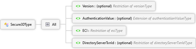 <xs:complexTypename="Secure3DType"xmlns:xs="http://www.w3.org/2001/XMLSchema"><xs:all><xs:elementname="Version"type="versionType"default="1"minOccurs="0"><xs:annotation><xs:documentation><pxmlns="http://Hps.Exchange.PosGateway">Indicates 3DS version used for authentication. Default version is 1.</p></xs:documentation></xs:annotation></xs:element><xs:elementname="AuthenticationValue"minOccurs="0"><xs:annotation><xs:documentation><pxmlns="http://Hps.Exchange.PosGateway">This value is the reference generated by the issuer to recognize that the authentication has taken place. Supported formats are CAVV, AEVV, UCAF. Must be encoded using base16 (Hex encoding) or base64 encoding.</p></xs:documentation></xs:annotation><xs:complexType><xs:simpleContent><xs:extensionbase="authenticationValueType"><xs:attributename="encoding"type="EncodingType"default="base64"><xs:annotation><xs:documentation><pxmlns="http://Hps.Exchange.PosGateway">Encoding used to encode binary AuthenticationValue. Default is base64.</p></xs:documentation></xs:annotation></xs:attribute></xs:extension></xs:simpleContent></xs:complexType></xs:element><xs:elementname="ECI"type="eciType"minOccurs="1"><xs:annotation><xs:documentation><pxmlns="http://Hps.Exchange.PosGateway">Electronic Commerce Indicator shows the value of the result of the authentication.</p><pxmlns="http://Hps.Exchange.PosGateway"><strong>Note:</strong> This value represents UCI for MasterCard.</p></xs:documentation></xs:annotation></xs:element><xs:elementname="DirectoryServerTxnId"type="directoryServerTxnIdType"minOccurs="0"><xs:annotation><xs:documentation><pxmlns="http://Hps.Exchange.PosGateway">The unique transaction identifier assigned by the Directory Server to identify a single transaction.</p><pxmlns="http://Hps.Exchange.PosGateway"><strong>Note:</strong> Required for MasterCard Identity Check (3DS Version 2) transactions in Authorization.</p></xs:documentation></xs:annotation></xs:element></xs:all></xs:complexType>
