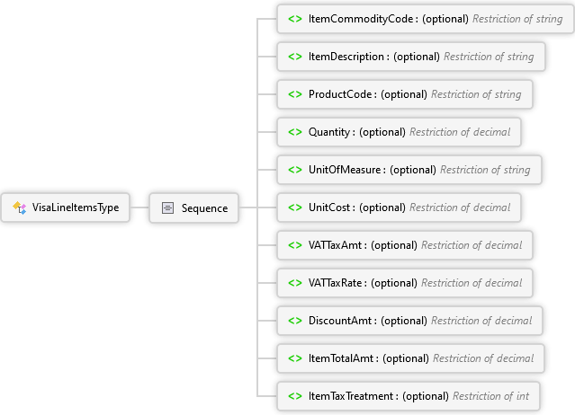 ItemTaxTreatment Element ItemTotalAmt Element DiscountAmt Element VATTaxRate Element VATTaxAmt Element UnitCost Element UnitOfMeasure Element Quantity Element ProductCode Element ItemDescription Element ItemCommodityCode Element Sequence VisaLineItemsType Complex Type