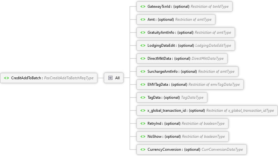 CreditAddToBatch is primarily used to add a previously approved open authorization (CreditAuth, CreditOfflineAuth, OverrideFraudDecline, or RecurringBillingAuth) to the current open batch. If a batch is not open this transaction will create one. It also provides the opportunity to alter data associated with the transaction (i.e. add a tip amount).