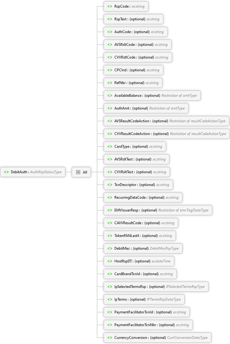 CurrencyConversion Element PaymentFacilitatorTxnNbr Element PaymentFacilitatorTxnId Element IpTerms Element IpSelectedTermsRsp Element CardBrandTxnId Element HostRspDT Element DebitMac Element TokenPANLast4 Element CAVVResultCode Element EMVIssuerResp Element RecurringDataCode Element TxnDescriptor Element CVVRsltText Element AVSRsltText Element CardType Element CVVResultCodeAction Element AVSResultCodeAction Element AuthAmt Element AvailableBalance Element RefNbr Element CPCInd Element CVVRsltCode Element AVSRsltCode Element AuthCode Element RspText Element RspCode Element All DebitAuth Element