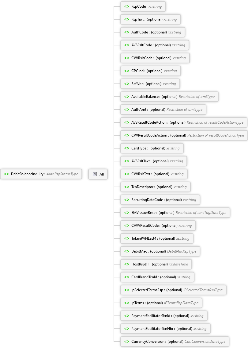 CurrencyConversion Element PaymentFacilitatorTxnNbr Element PaymentFacilitatorTxnId Element IpTerms Element IpSelectedTermsRsp Element CardBrandTxnId Element HostRspDT Element DebitMac Element TokenPANLast4 Element CAVVResultCode Element EMVIssuerResp Element RecurringDataCode Element TxnDescriptor Element CVVRsltText Element AVSRsltText Element CardType Element CVVResultCodeAction Element AVSResultCodeAction Element AuthAmt Element AvailableBalance Element RefNbr Element CPCInd Element CVVRsltCode Element AVSRsltCode Element AuthCode Element RspText Element RspCode Element All DebitBalanceInquiry Element