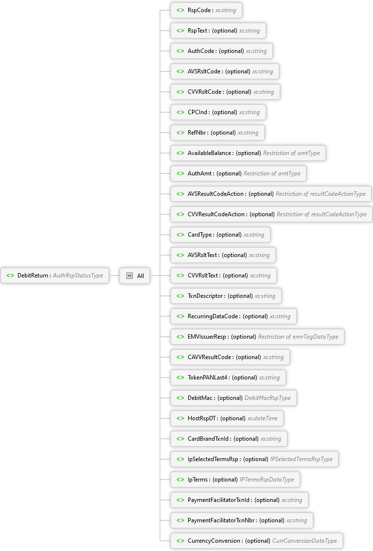 CurrencyConversion Element PaymentFacilitatorTxnNbr Element PaymentFacilitatorTxnId Element IpTerms Element IpSelectedTermsRsp Element CardBrandTxnId Element HostRspDT Element DebitMac Element TokenPANLast4 Element CAVVResultCode Element EMVIssuerResp Element RecurringDataCode Element TxnDescriptor Element CVVRsltText Element AVSRsltText Element CardType Element CVVResultCodeAction Element AVSResultCodeAction Element AuthAmt Element AvailableBalance Element RefNbr Element CPCInd Element CVVRsltCode Element AVSRsltCode Element AuthCode Element RspText Element RspCode Element All DebitReturn Element
