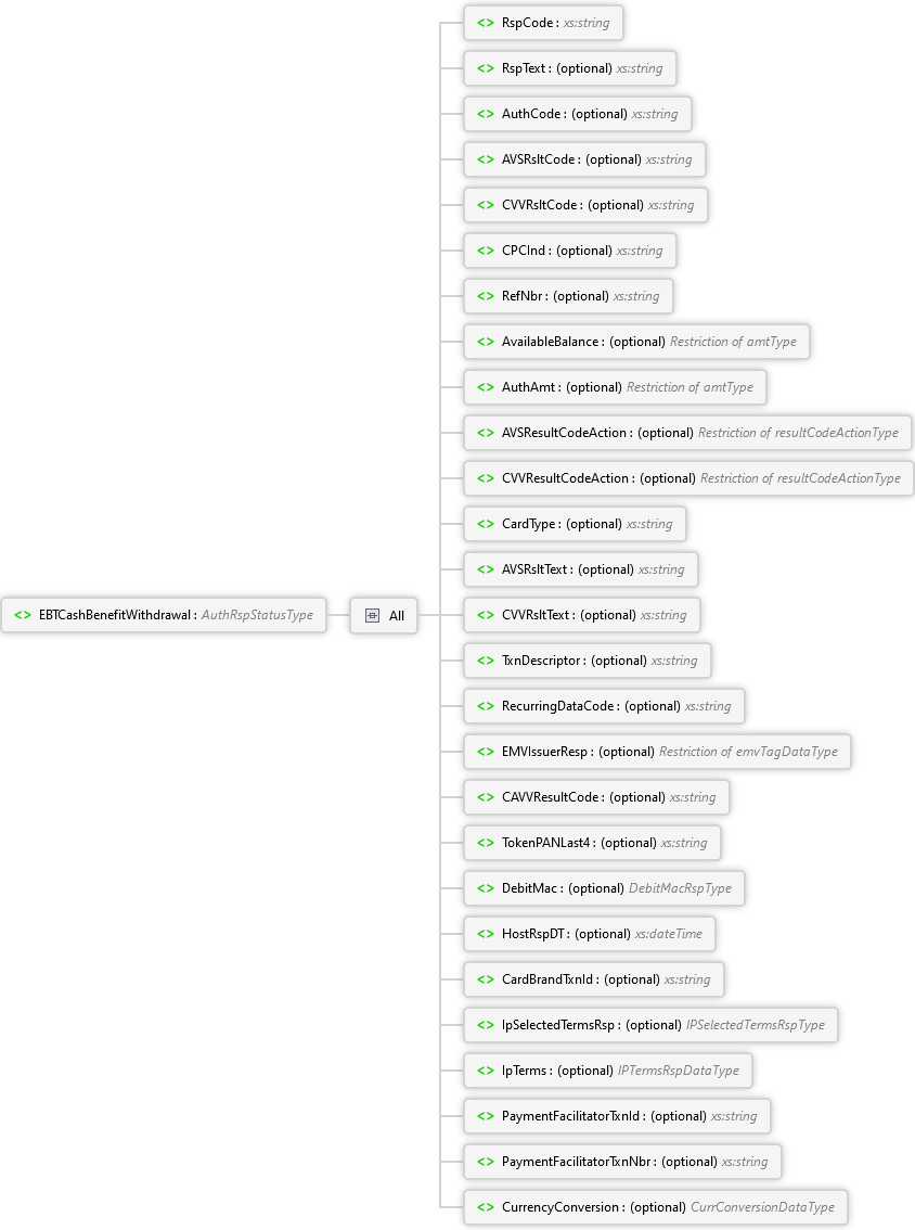 CurrencyConversion Element PaymentFacilitatorTxnNbr Element PaymentFacilitatorTxnId Element IpTerms Element IpSelectedTermsRsp Element CardBrandTxnId Element HostRspDT Element DebitMac Element TokenPANLast4 Element CAVVResultCode Element EMVIssuerResp Element RecurringDataCode Element TxnDescriptor Element CVVRsltText Element AVSRsltText Element CardType Element CVVResultCodeAction Element AVSResultCodeAction Element AuthAmt Element AvailableBalance Element RefNbr Element CPCInd Element CVVRsltCode Element AVSRsltCode Element AuthCode Element RspText Element RspCode Element All EBTCashBenefitWithdrawal Element