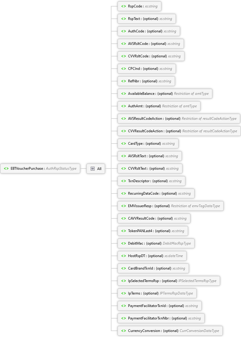 CurrencyConversion Element PaymentFacilitatorTxnNbr Element PaymentFacilitatorTxnId Element IpTerms Element IpSelectedTermsRsp Element CardBrandTxnId Element HostRspDT Element DebitMac Element TokenPANLast4 Element CAVVResultCode Element EMVIssuerResp Element RecurringDataCode Element TxnDescriptor Element CVVRsltText Element AVSRsltText Element CardType Element CVVResultCodeAction Element AVSResultCodeAction Element AuthAmt Element AvailableBalance Element RefNbr Element CPCInd Element CVVRsltCode Element AVSRsltCode Element AuthCode Element RspText Element RspCode Element All EBTVoucherPurchase Element