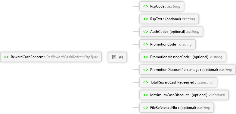 FileReferenceNbr Element MaximumCashDiscount Element TotalRewardCashRedeemed Element PromotionDiscountPercentage Element PromotionMessageCode Element PromotionCode Element AuthCode Element RspText Element RspCode Element All RewardCashRedeem Element